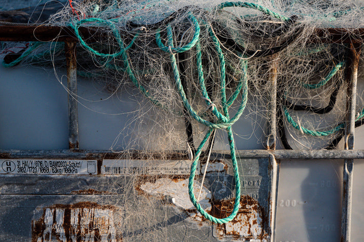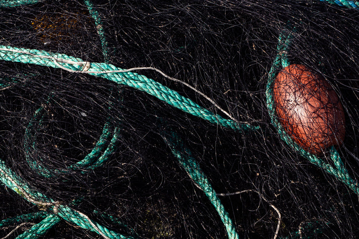 Après des mois de tests, nous broyons aujourd’hui l’un des plus importants déchets marins : les filets de pêche abandonnés dits “filets de pêche fantômes” qui se retrouvent malheureusement souvent au fond des océans. Mixés avec les bouteilles en PET broyées, ils composent notre "SEADUST", un concept unique avec lequel nous fabriquons nos semelles signatures à base de caoutchouc recyclé.