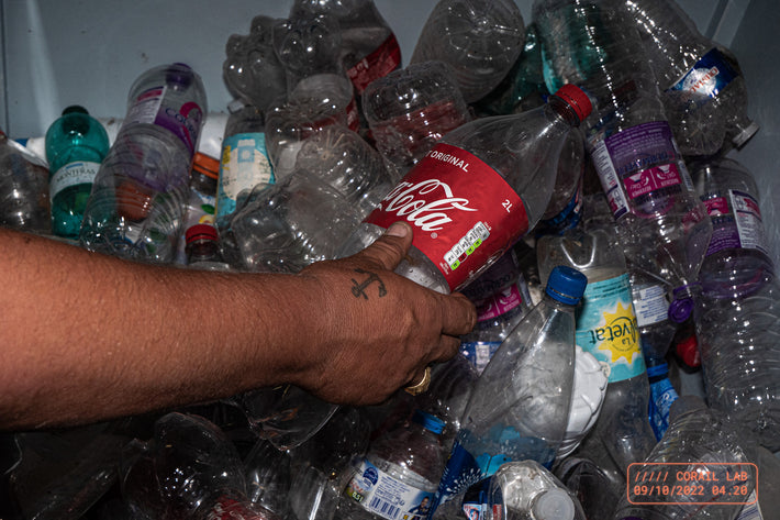 Les bouteilles plastique en PET sont les premiers déchets que nous avons transformés dans le CORAIL° Lab. Ce sont des matériaux polyvalents que nous broyons. Les bouteilles, bouchons et étiquettes colorées sont utilisées dans comme matière première pour fabriquer nos semelles extérieures en caoutchouc recyclé.